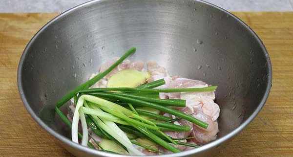 第一步:雞腿清洗幹凈並剁成大塊,再用清水多清洗幾遍,洗掉裡面的血水。然後加入薑片、蔥段、少許花雕酒、胡椒粉、鹽,下手抓拌一下再醃制5分鐘。