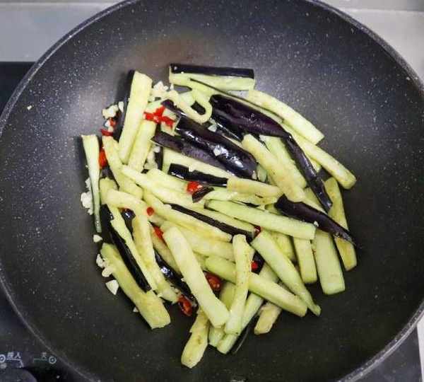 第10步、倒入茄條煸炒30秒。