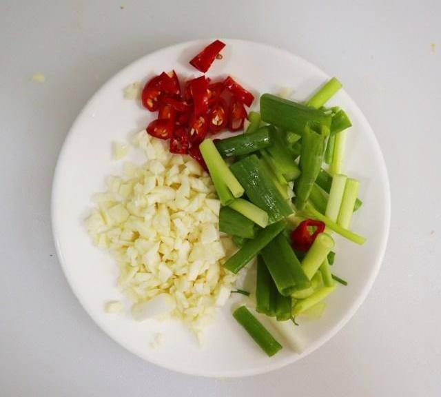 第4步、蒜切成蒜末,辣椒切圈,小蔥切段備用。