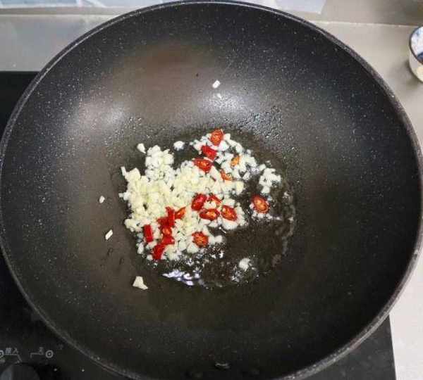 第9步、炒鍋中放適量的油,辣椒蒜末炸香。