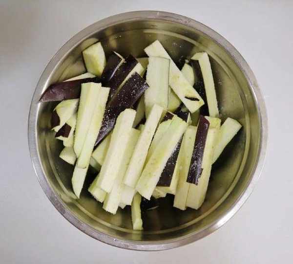 第3步、茄子切成一指寬左右的長條,加鹽翻拌均勻,醃制10分鐘。
