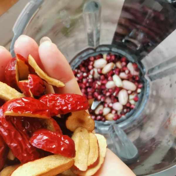 第三步:破壁機中加入清水,把黑玉米和鮮土豆放入,再把大棗去核,一起放入,這樣搭配打出的糊口感微甜清香好喝。