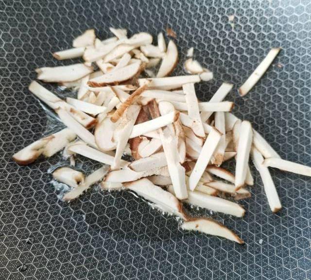 第2步、熱鍋下油,放入香菇絲煸炒一下。
