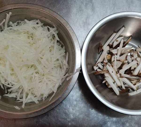 第1步、把白蘿卜洗凈去皮,用刨絲刀刨成絲備用,香菇切成絲備用。