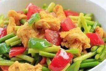 4、鍋裡留底油,下蒜薹、辣椒翻炒均勻至斷生,下西紅柿塊翻炒出水分,加鹽、生抽翻炒均勻,下雞蛋塊翻炒均勻即可出鍋裝盤。
