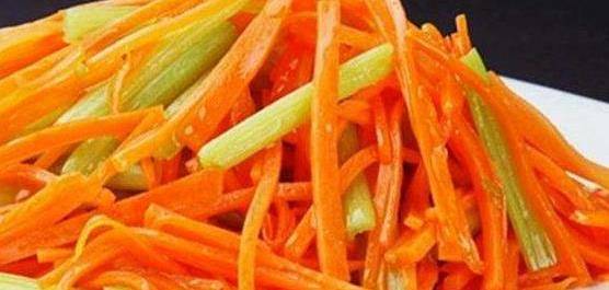 做法:1、將胡蘿卜洗凈去皮切絲;香芹擇去老葉,洗凈切段;
