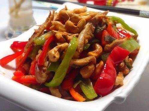 材料:雞肉250克、食鹽適量、雞精5g、蔥10g、花椒5g、料酒20ml、淀粉10g、調和油適量、胡椒粉5g、紅椒25g、元貞糖5g、芝麻油5ml、柿子椒25g