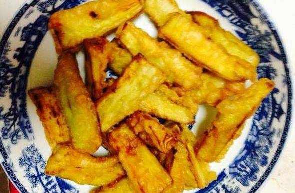 第四步,接著將切好的茄子放入蛋粉糊中,逐個的裹上一層蛋粉糊。然後起鍋燒油(因為要炸茄子,油可以多放一點。),油燒至六成熱以後,把裹瞭雞蛋糊的茄子放入油鍋裡炸至金黃色,外皮酥脆時撈出來控一下油裝好待用。