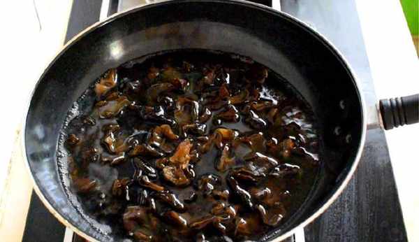 4、木耳泡發完成後撕成小條,鍋裡放清水燒開,木耳放開水裡焯5分鐘,取出後過涼水洗凈備用;