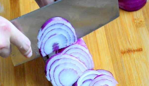 2、等待木耳泡發的時候,我們把洋蔥洗凈去掉頭尾,對半切開後切絲備用;