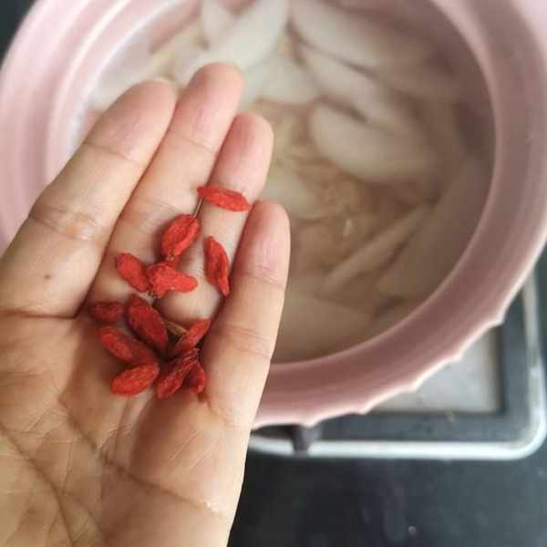 所用資料:梨子1個,百合適量,老冰糖少許,枸杞少許。