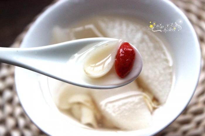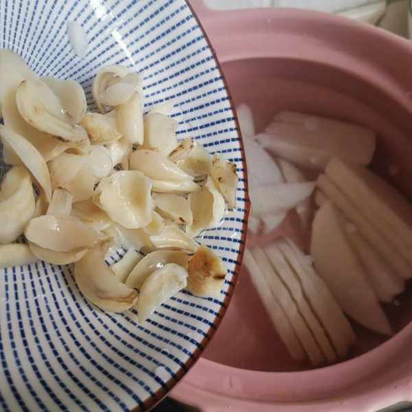 第四步:再放入百合,大火燒開,輕輕的撇去浮沫,改成小火慢慢的熬煮大約20分鐘。