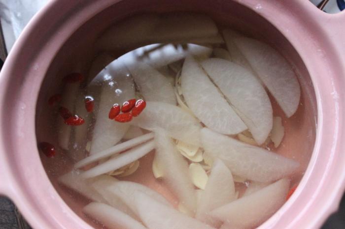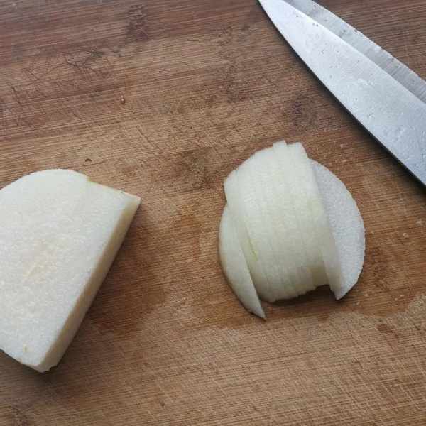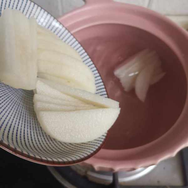第三步:砂鍋中放入清水,把切好的梨子放入。