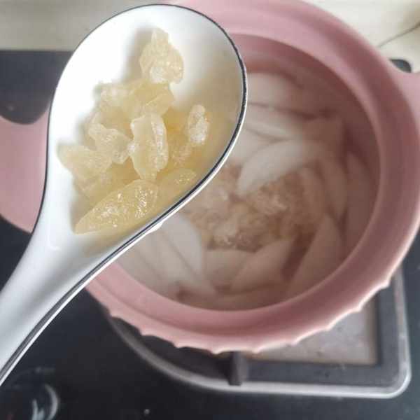 第五步:這時梨子已經呈透明狀,把老冰糖放入,老冰糖的多少可以隨意。