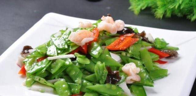 荷蘭豆250克,木耳50克,蝦仁150克,紅椒片20克,蒜薑片10克。