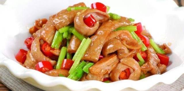 豬大腸350克,香芹100克,紅椒丁50克,蒜薑片10克。