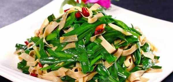 豆幹100克,韭菜250克,辣椒幹適量,蒜薑末10克。