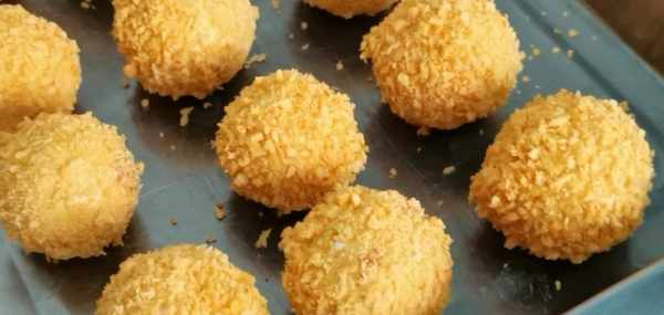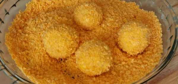 10.然後把它放入到面包糠中,每個丸子都均勻的裹上面包糠,然後放在一旁備用。