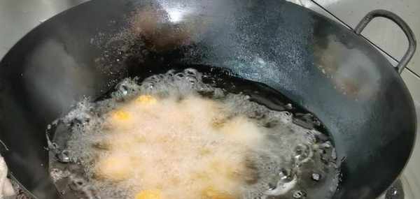 11.接下來鍋中加油燒至四成熱,把裹上面包糠的南瓜丸子,逐個放入油鍋中,開始炸制,這一步操作中油溫不能太高,如果油溫太高,南瓜丸子會很容易焦糊。