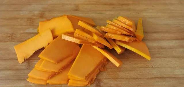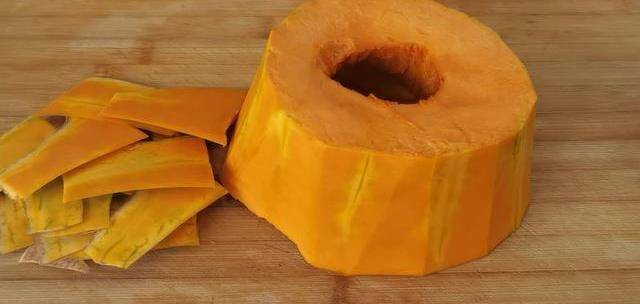 1.首先選擇一塊老南瓜,去皮洗凈後切成薄片,放入碗中上鍋蒸熟。