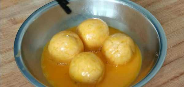 9.把揉搓好的南瓜豆沙丸子,放入到蛋液中,表面均勻的裹上雞蛋液。