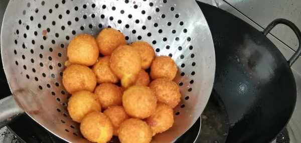 12.在炸至的過程中,要不停的翻動,它受熱均勻,炸至到表皮金黃,每一個丸子都漂浮起來,然後就可以撈出控油,我們的酥脆南瓜丸子就做好瞭。