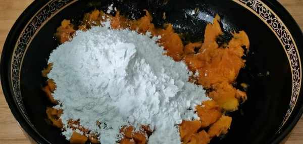 2.然後把蒸熟的南瓜倒入一個大碗中,加入適量的糯米粉,南瓜的含水量不同,所以加入的糯米粉視情況而定。