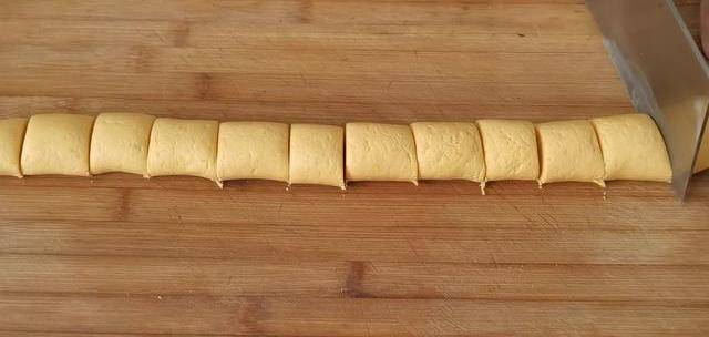 5.醒發好的面團直接放在案子上,揉搓成長條,然後改刀成均勻的小劑子。