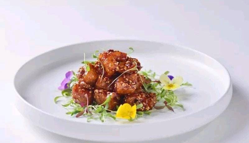 待汁能掛在肉上撒入辣椒皮和白芝麻炒勻裝盤即可
