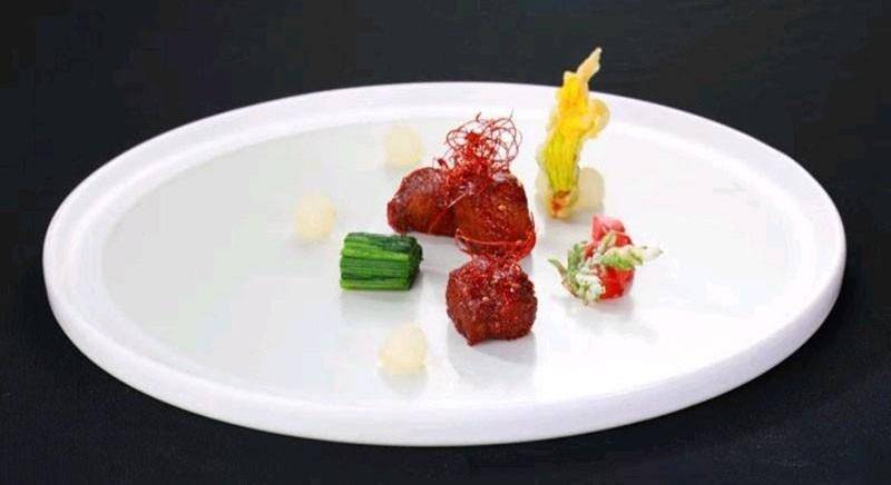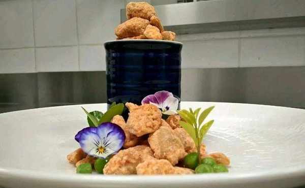 牛肉放入鍋中,用高溫煎封表面,再入7成油溫鍋中炸至表皮酥脆盛出
