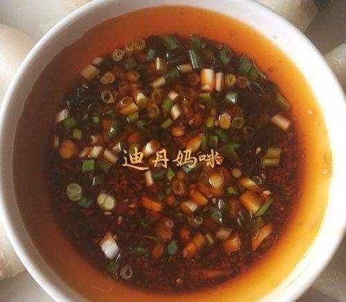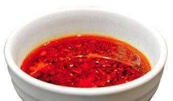 做法:碗中放入冷鮮湯,鹽,雞精,醬油,醋調勻,確定咸度和顏色後再放入泡野山椒末,泡辣椒末攪勻,最後放入香油。