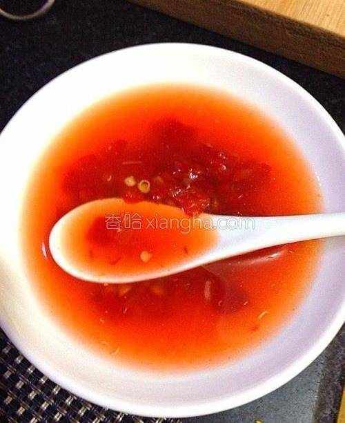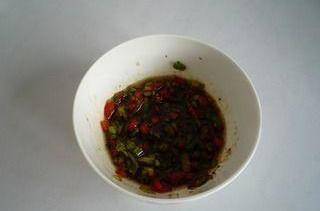 做法:青尖椒末,紅尖椒末,鹽入碗拌勻,加入冷鮮湯,雞精,醬油調勻。
