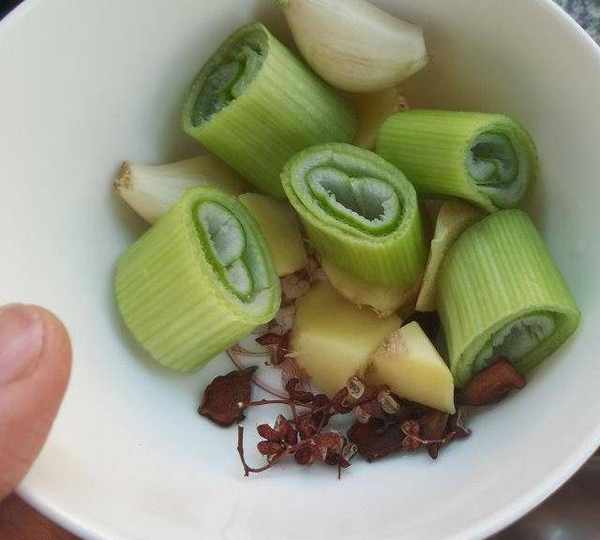 第14步、準備蔥薑蒜和花椒大料。