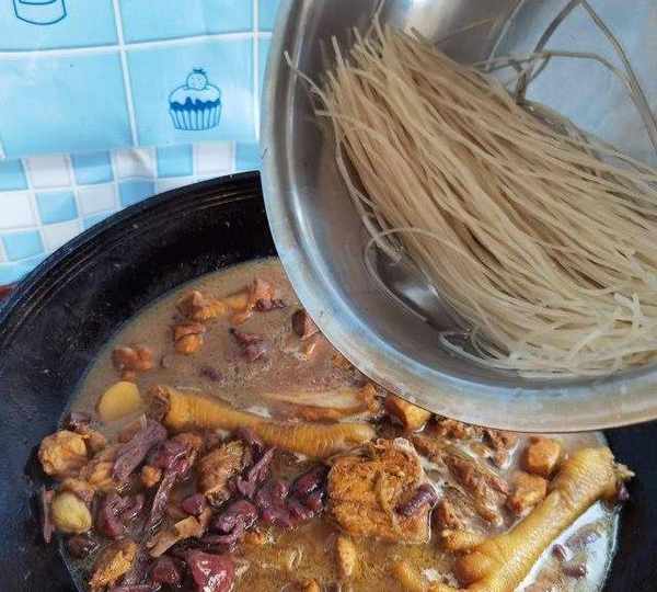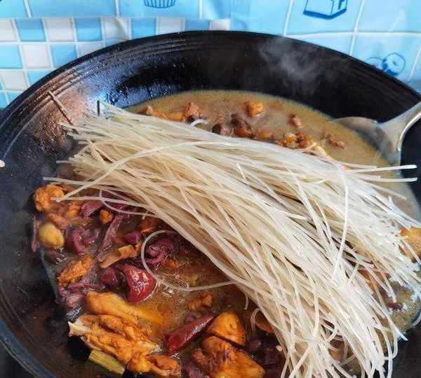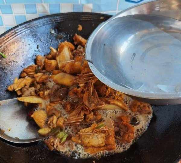 第28步、25分鐘後,雞塊基本燉爛,紅蘑控幹水分,倒入雞塊。