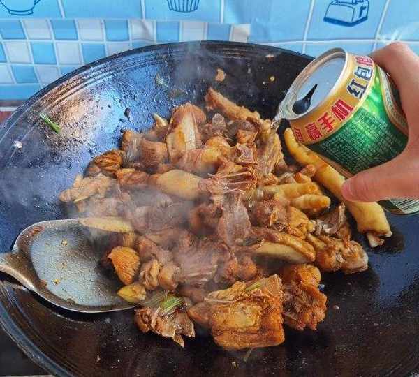 第23步、炒上色均勻後,倒入一罐啤酒。