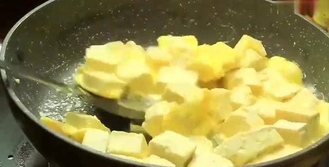 準備一個小碗,打入兩個雞蛋,攪拌均勻。放小勺的鹽,再來點清水。鍋內倒入油,油燒熱把豆腐倒進來,先不要翻動搖晃鍋,使底部定型,變形之後再翻炒,炒至豆腐變金黃色,這樣就可以瞭,撈出來備用。鍋內留底油,把肉末放起來,炒肉末變白色。再把蒜放進來炒出香味。