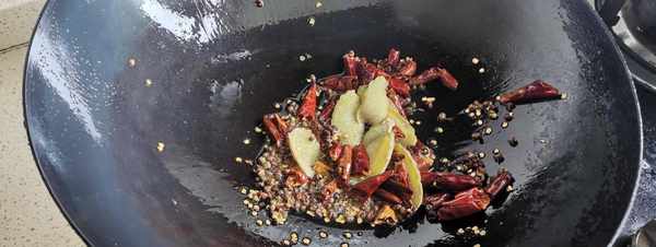 炒鍋加油倒入花椒 麻椒 薑片 蒜片