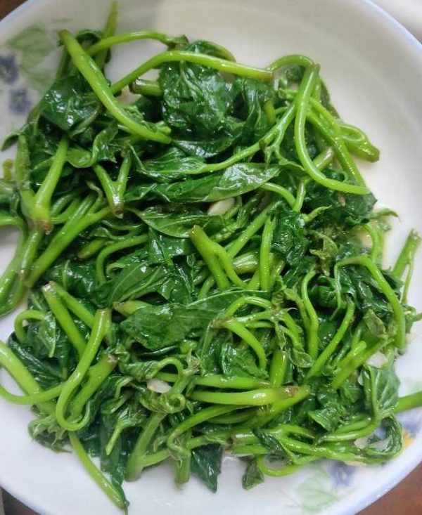 食材:紅薯葉尖400克,蒜末少許,鹽半勺,食用油適量。