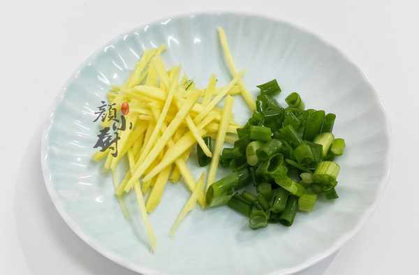 步驟三:生薑去皮洗凈切成絲,蔥擇洗幹凈切成末備用。