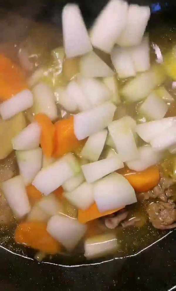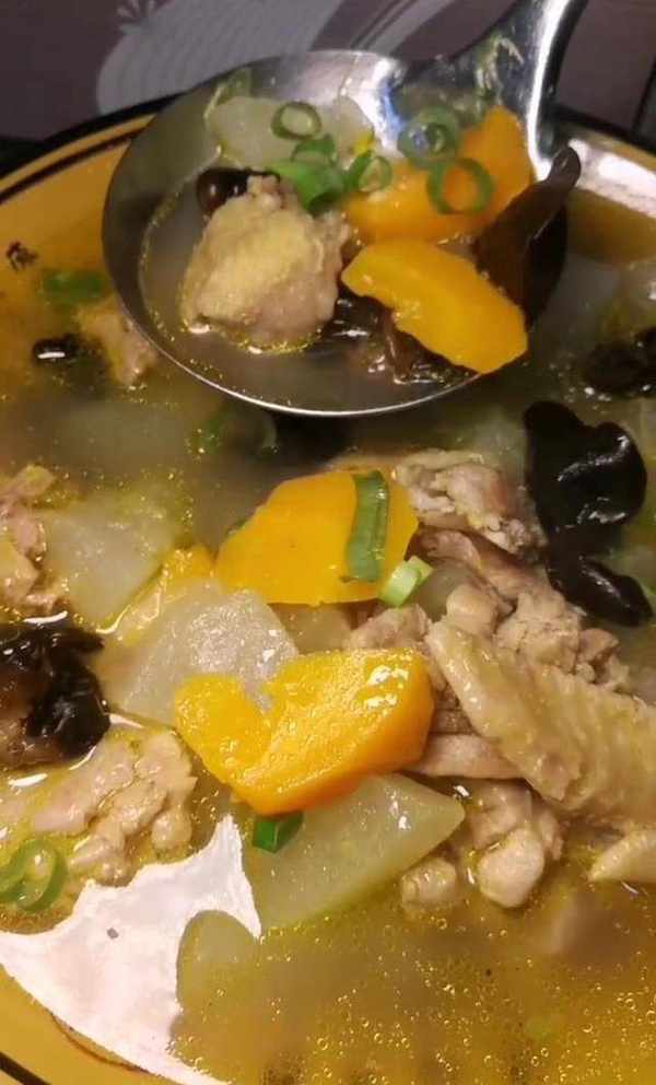 最後再把冬瓜和胡蘿卜下進鍋中,接著再把鍋蓋蓋上,熬上10分鐘,接著再放入木耳、鹽、雞粉、蔥、花椒粉等調料調味。