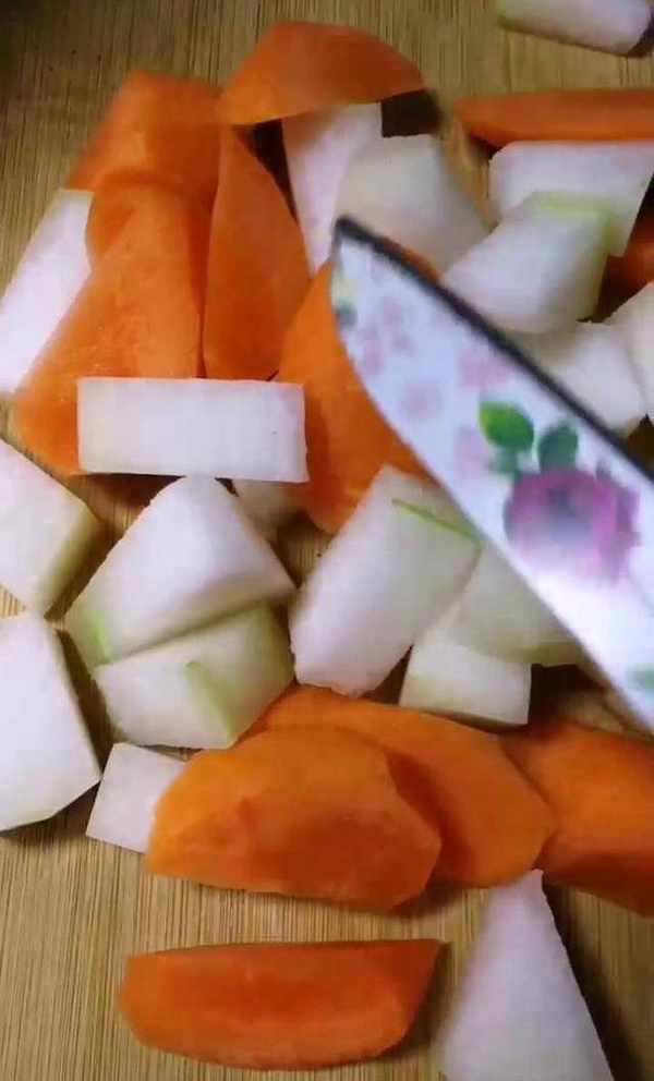 首先先準備食材,把冬瓜切成塊,紅蘿卜切成塊,再把買來的老母雞也切成塊,放在一邊備用。