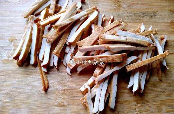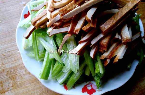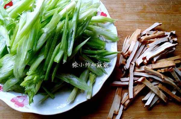 1、食材準備:新鮮的芹菜一把(選擇大芹菜),摘掉葉子,洗凈切絲。香幹幾塊洗凈切絲。