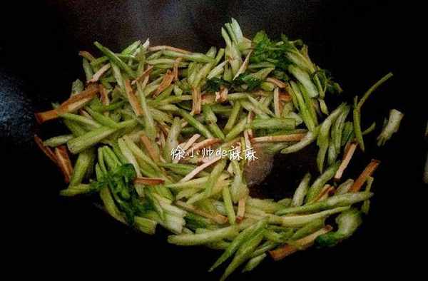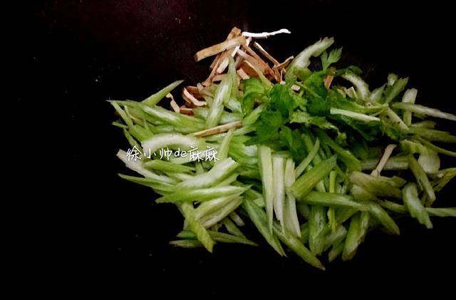2、熱鍋熱油,將芹菜絲和香幹絲一起倒入鍋內,翻炒出汁水。