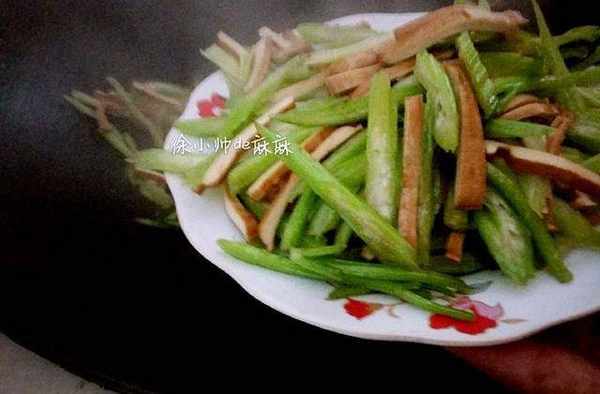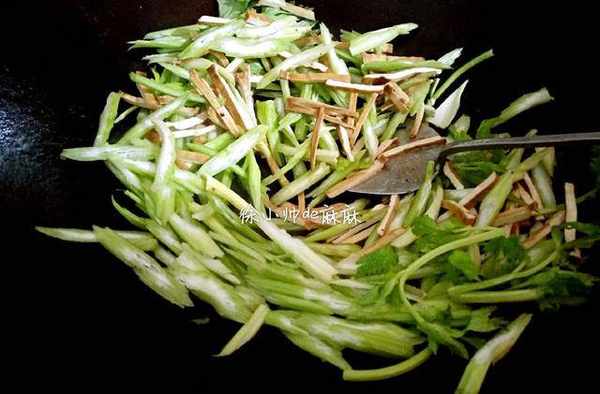 3、加入鹽和少許白糖,將芹菜和豆幹快速的翻炒幾分鐘即可。