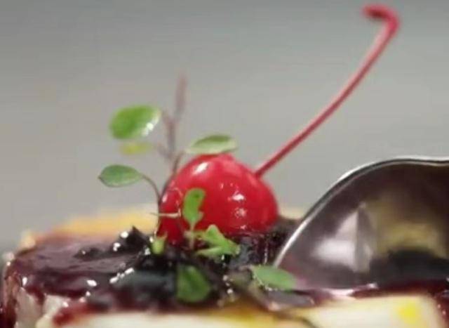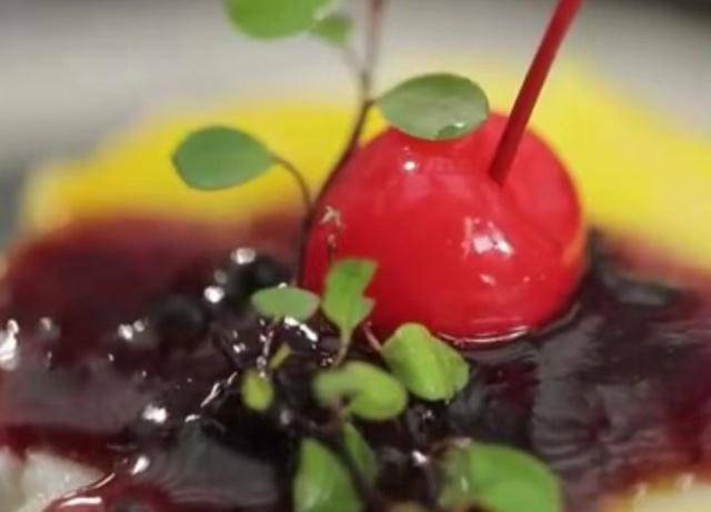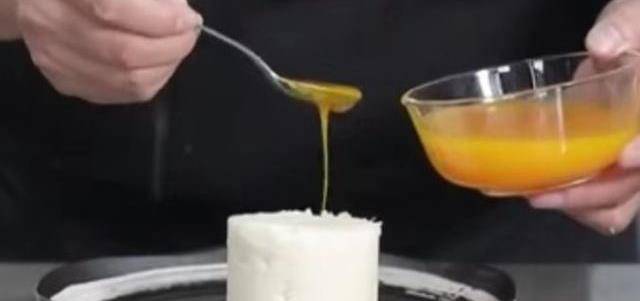 4、將山藥泥裝入磨具內,輕壓成型(但要壓實,不能有空隙),將磨具取下,稍加修整;淋上橙汁,再淋上藍莓汁,稍加點綴即可。