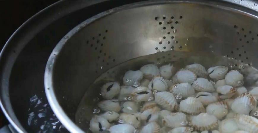 鍋中放入適量的水,將水燒至滾燙後,用帶漏洞的盆子裝上血蚶,放入滾燙熱水涮一遍,約10秒左右後撈出。(撈出後可以上下篩一下,受熱更加均勻些)煮血蚶的時間不能過短,也不可過長。一般建議在10秒左右。