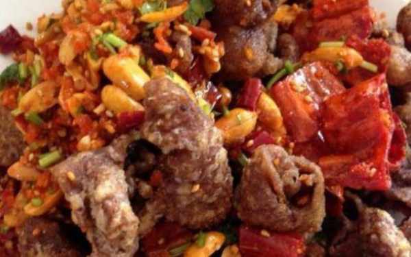 5.倒入炒熟的花生和炸好的肥腸,加入適量鹽翻炒幾下即可出鍋。
