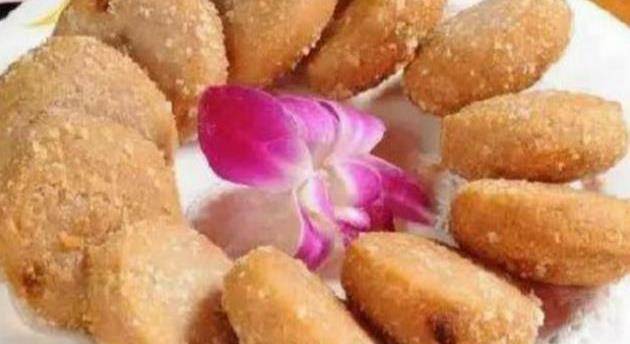 3.將香芋面團制成小圓餅狀,外層粘上面包糠。