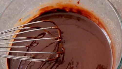 2.用手動打蛋器攪拌,讓巧克力在黃油液體中全部融化,繼續攪拌至完全混合,顏色呈均勻的亮光光的。