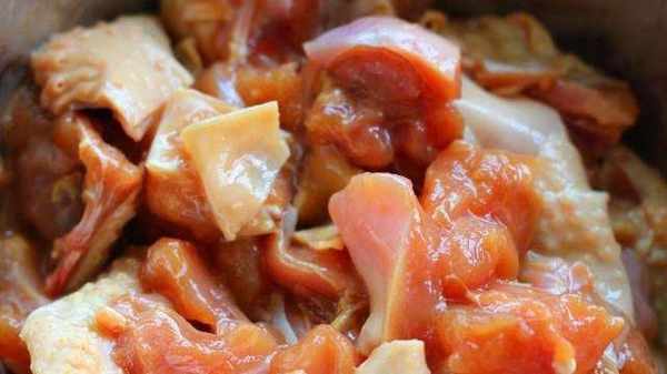 1.把新鮮的雞肉去骨,切成小丁,放入碗中,加入料酒、生抽、鹽、味精、五香粉、白胡椒、蠔油進行醃制。